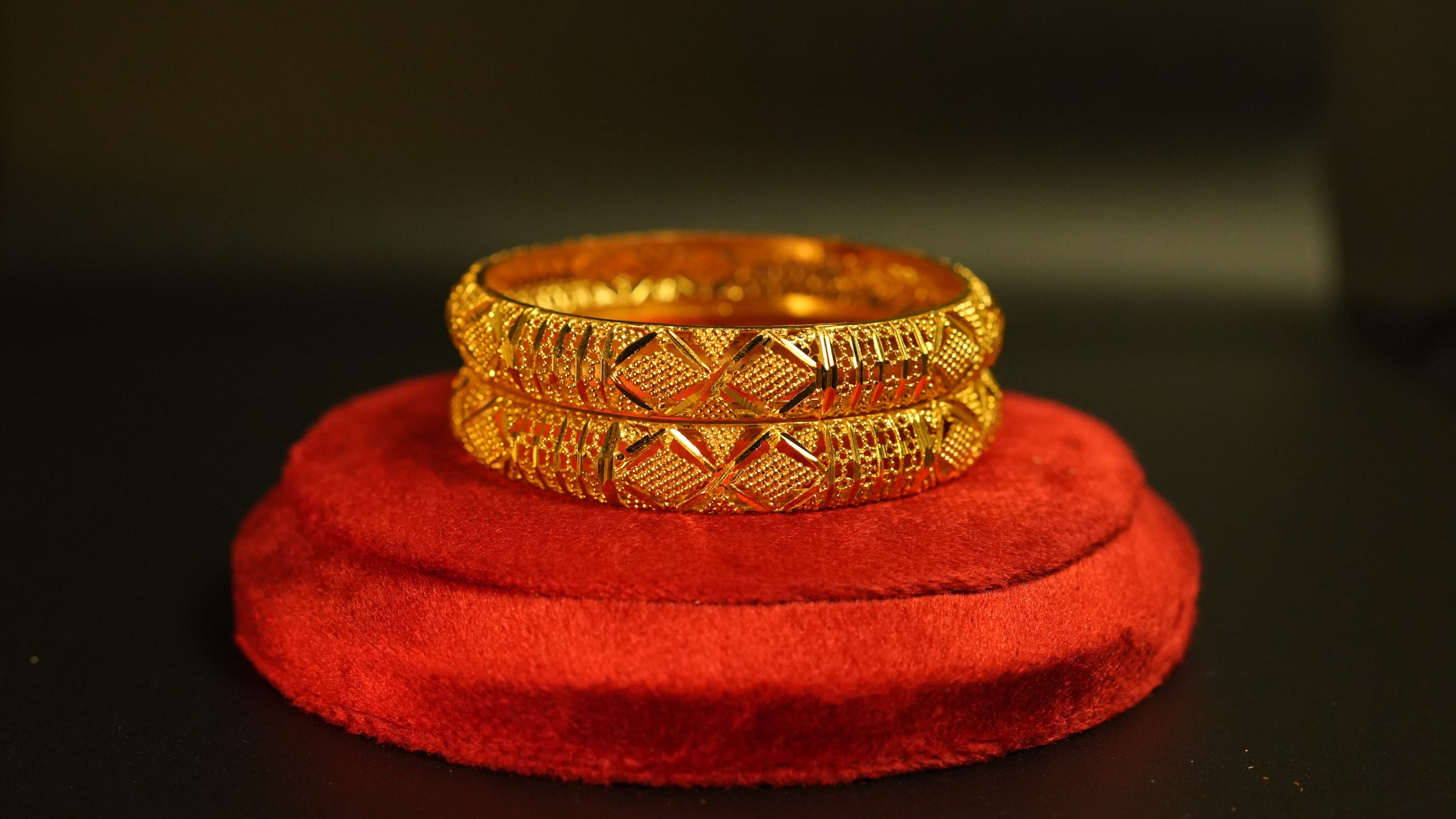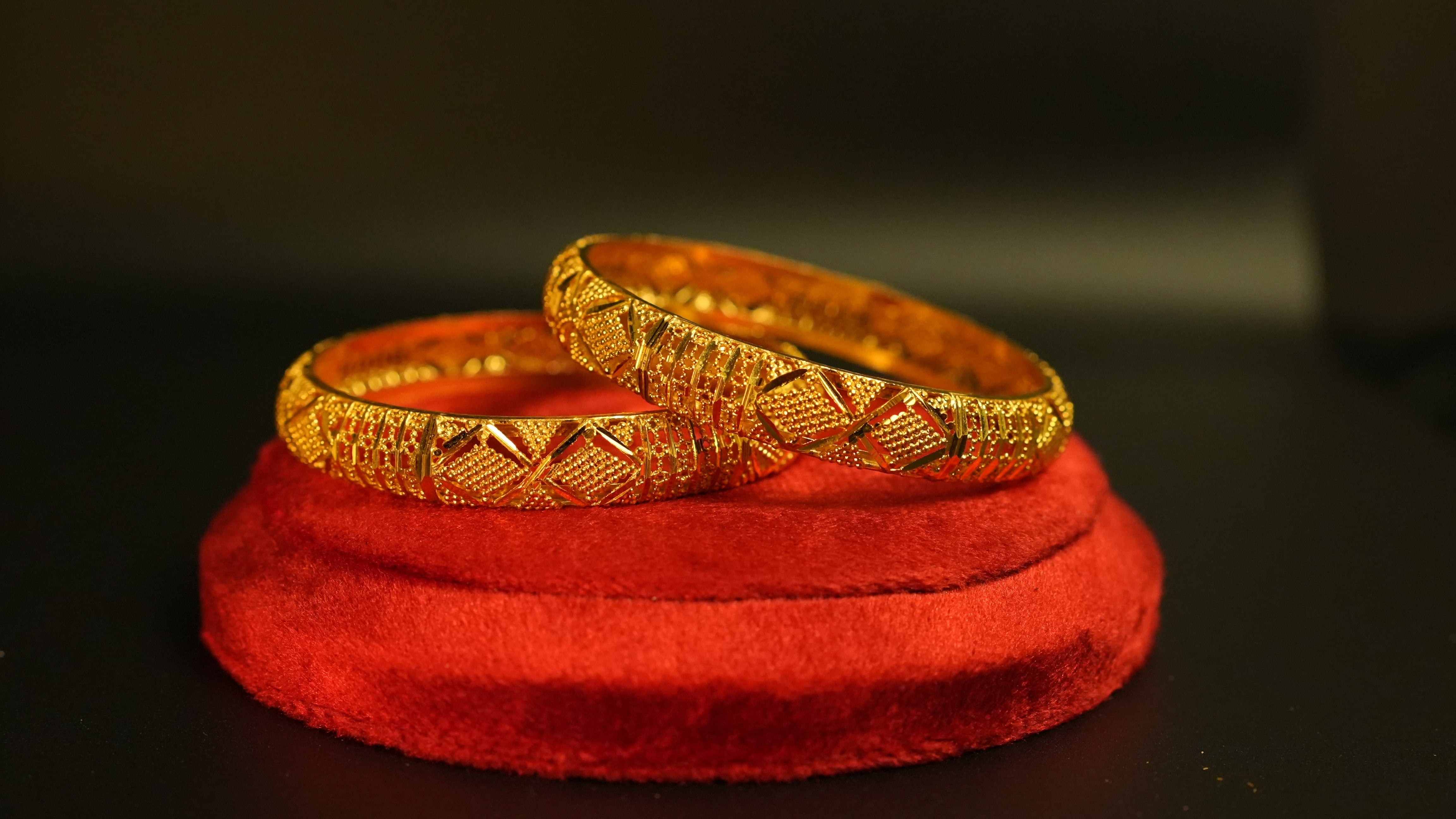 Rich in heritage and glow, the Gulnaar Spark bangles reflect luxury through their detailed mesh design and luminous shine.