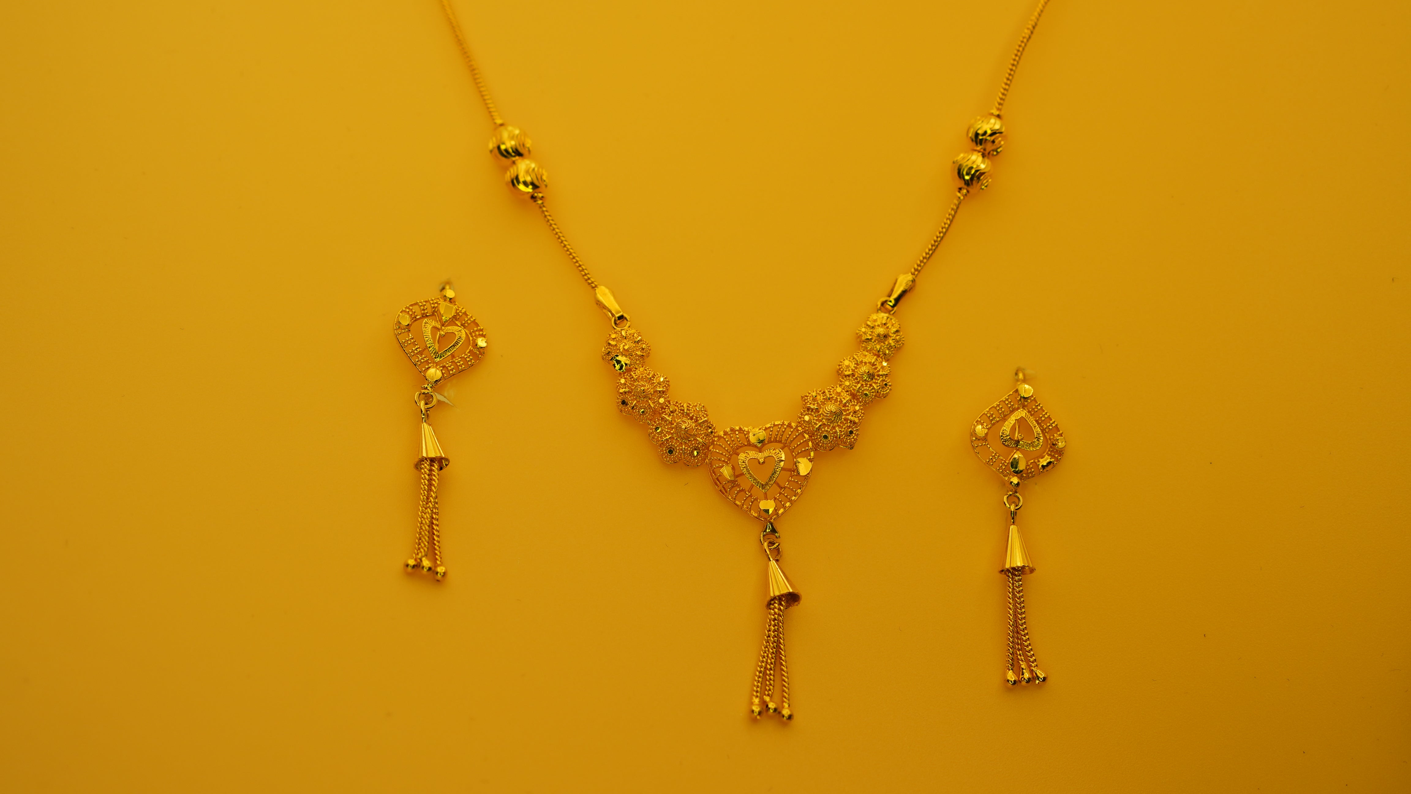This radiant gold creation brings together floral beauty and timeless craftsmanship. Its detailed patterns and matching earrings make it ideal for both festive and formal wear.