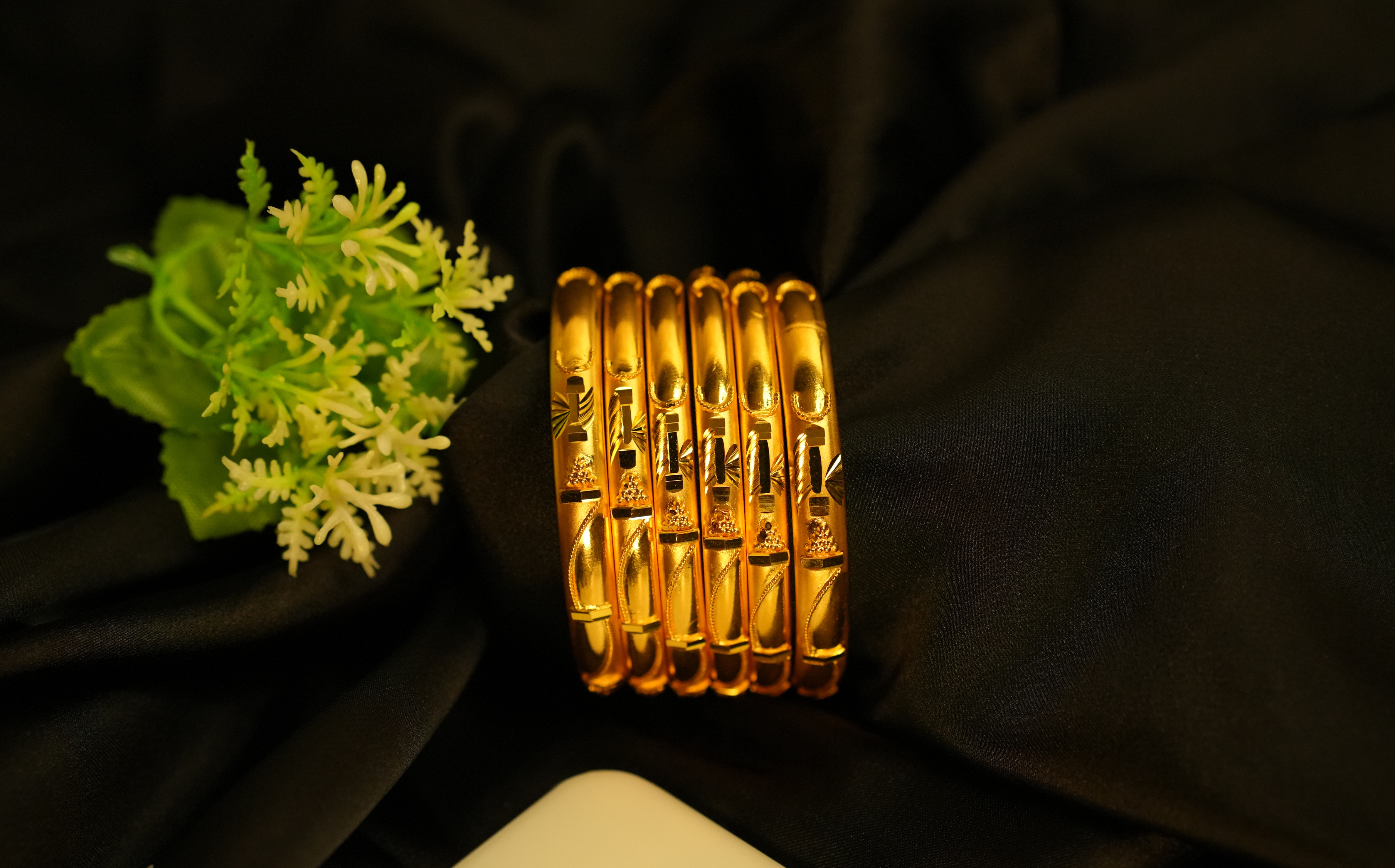 A perfect blend of elegance and tradition, the Golden Harmony Bangle Set features beautifully engraved gold-toned bangles designed to add timeless charm to your look. Ideal for weddings, festive occasions, and daily wear, these bangles bring a graceful shine and royal touch to every outfit.