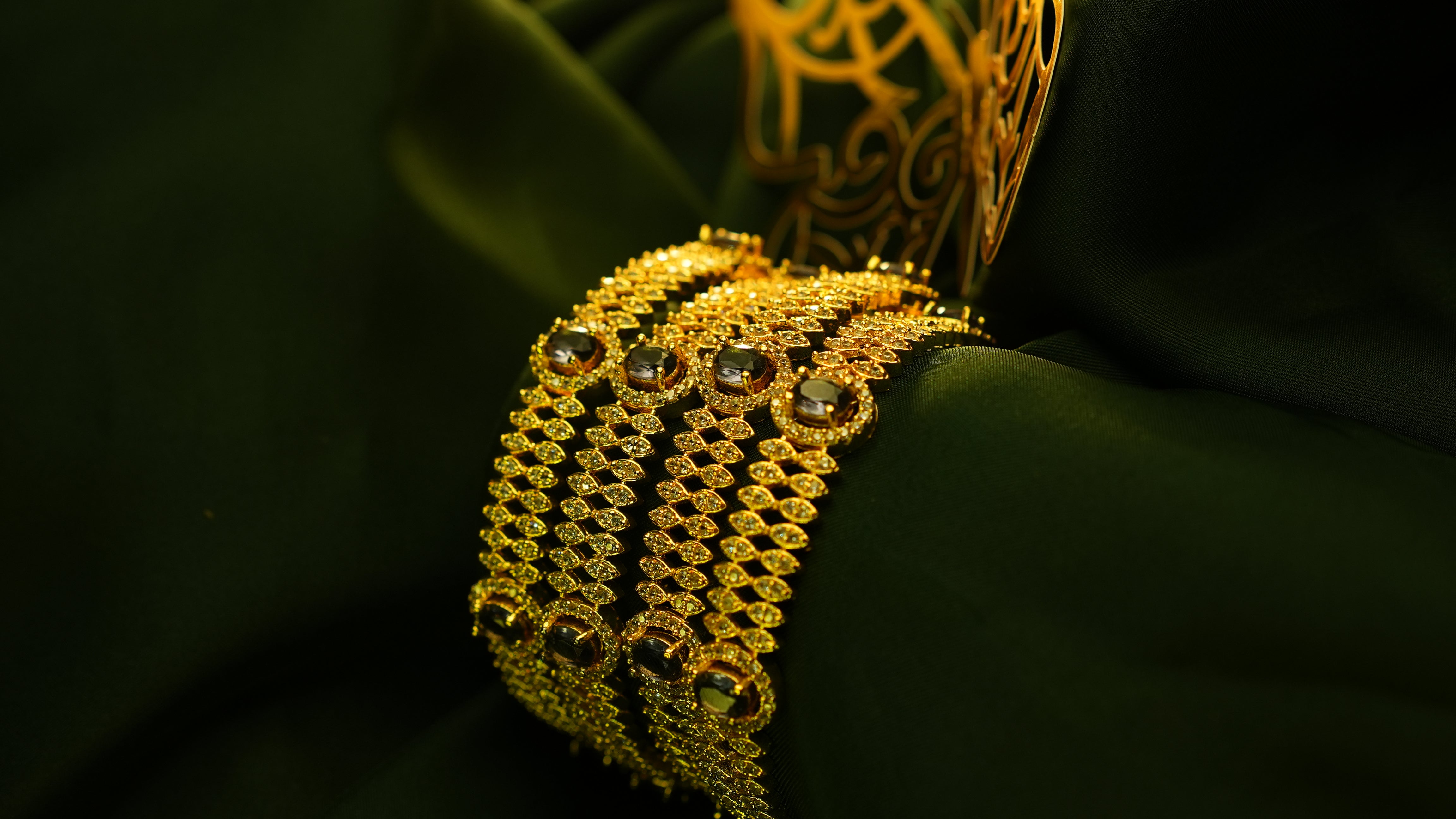 Enhance your elegance with our Majestic Glow Gold Bangles , a timeless fusion of traditional artistry and modern sophistication. Crafted with intricate floral detailing, sparkling stones, and a luxurious gold finish, these bangles are perfect for weddings, festive occasions, or any celebration that calls for a regal touch. Designed for comfort and glamour, this set adds a graceful charm to every outfit.