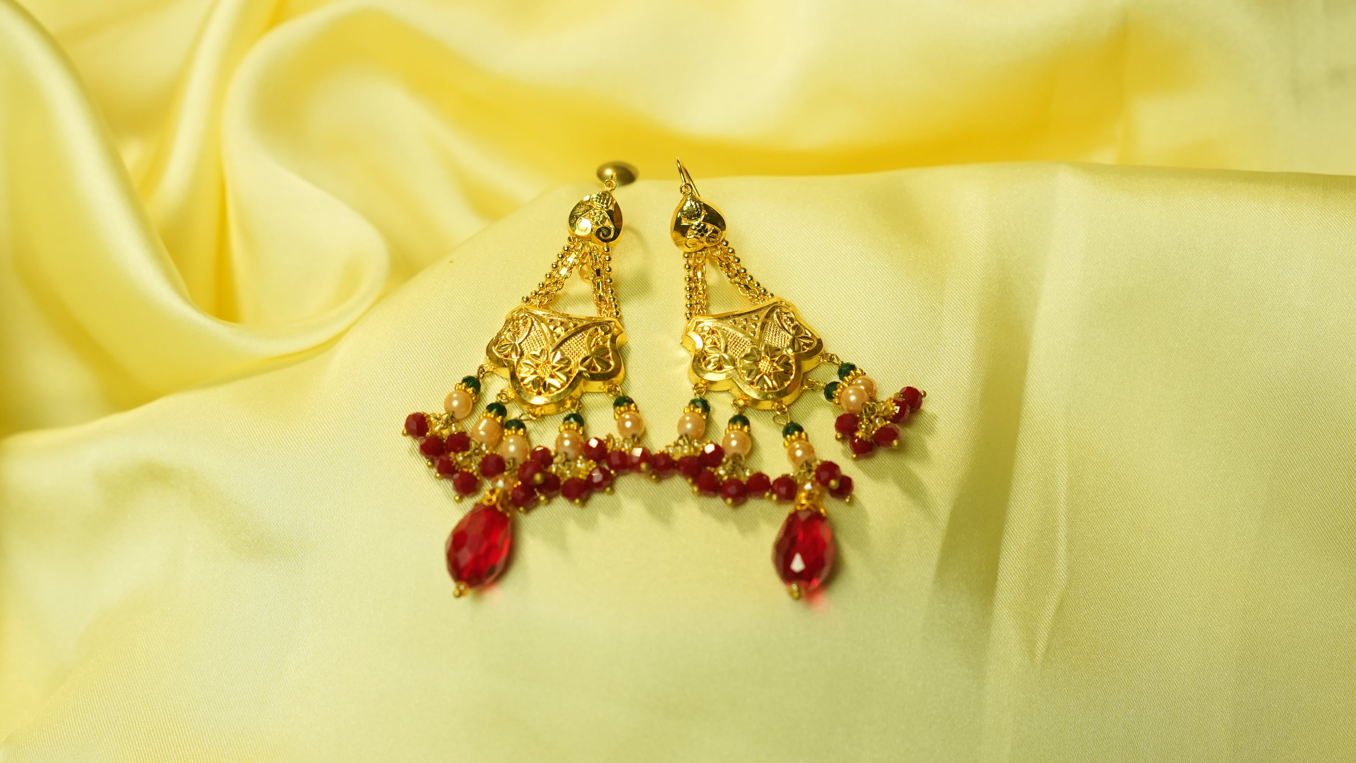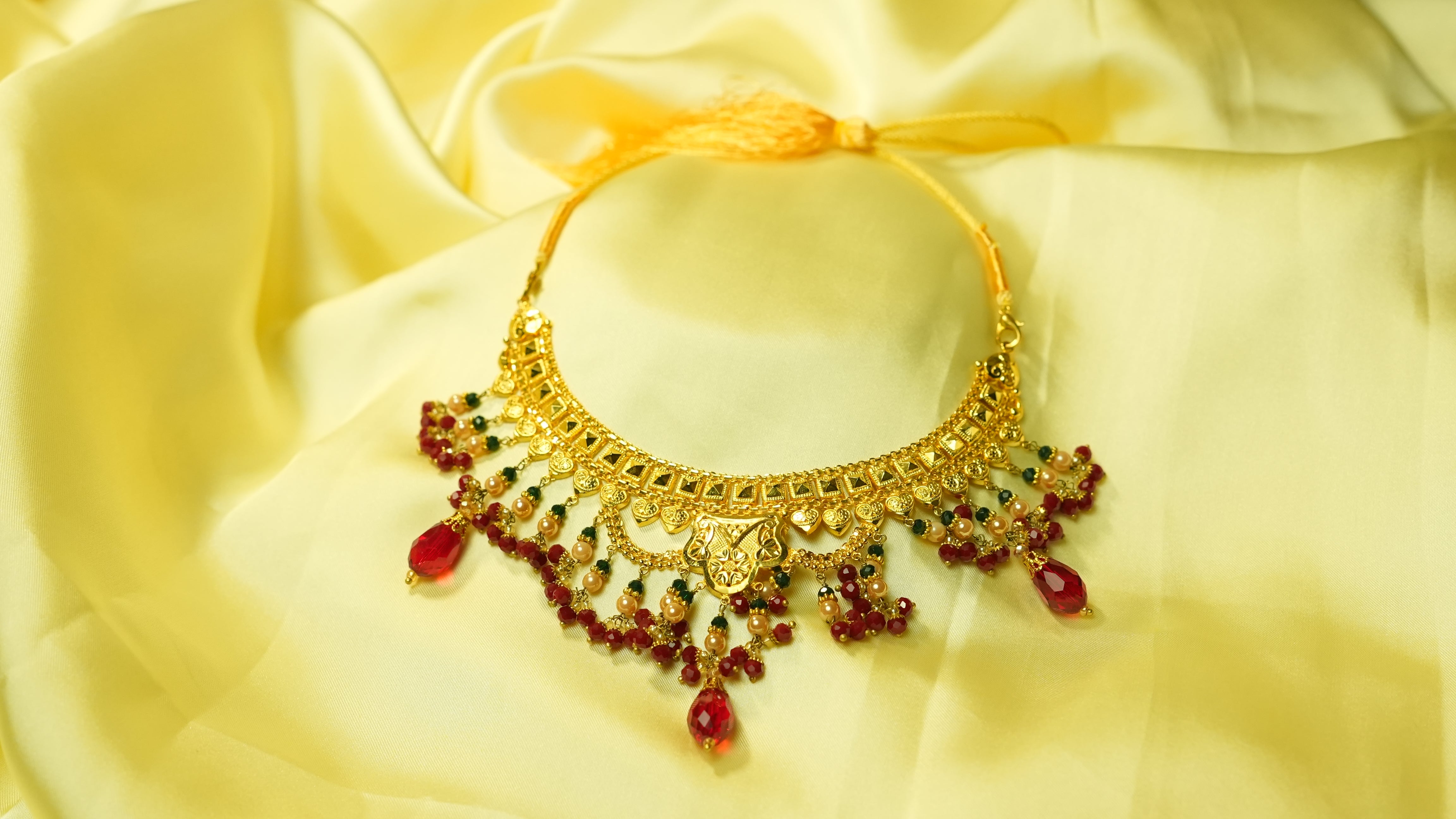 Add a touch of royal elegance to your look with our Regal Ruby & Emerald Gold-Plated Necklace Set. This exquisite piece showcases a finely detailed gold-plated design, embellished with deep red ruby stones, green emerald beads, and delicate pearl accents. The statement necklace is perfectly complemented by matching earrings, making it ideal for weddings, festive occasions, and traditional gatherings. The intricate craftsmanship and luxurious color combination bring out a timeless charm that enhances any ethnic outfit.