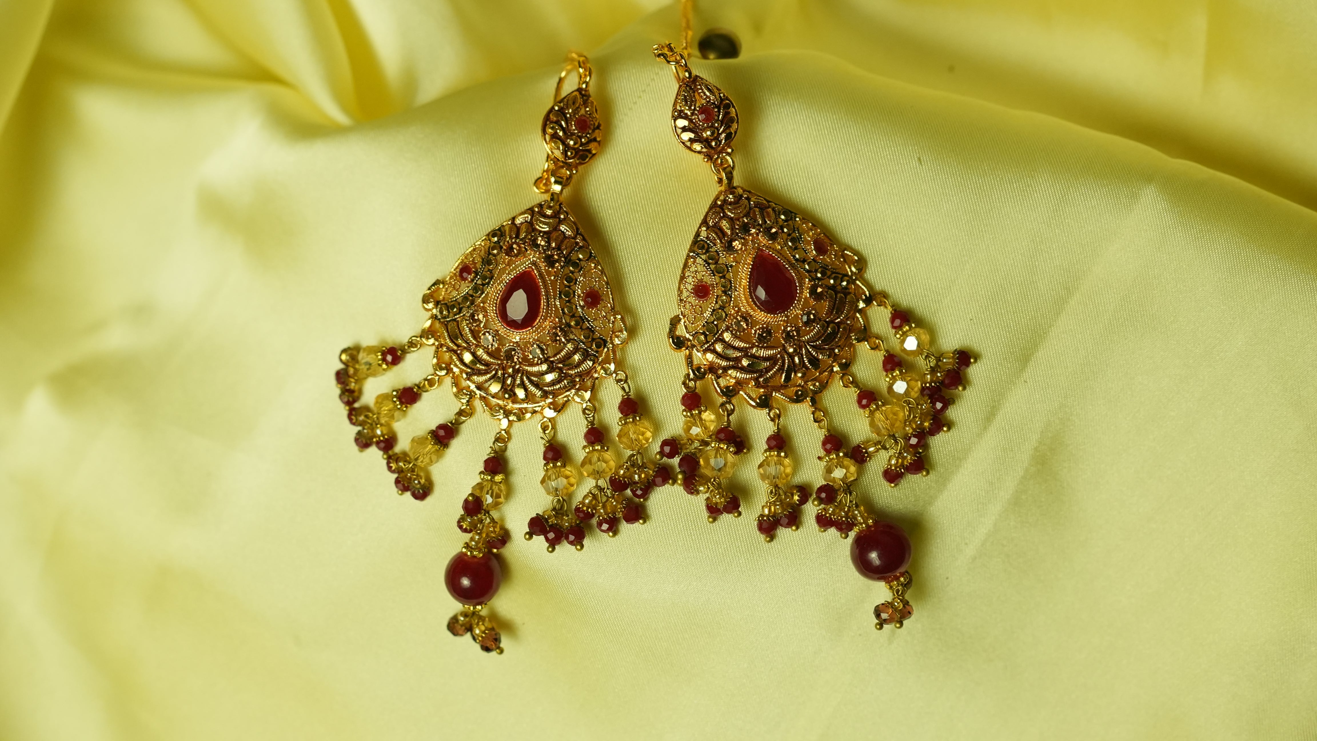 Elevate your bridal elegance with this Royal Ruby Gold-Plated Jewelry Set, a masterpiece of traditional craftsmanship and regal charm. The set includes a beautifully detailed choker-style necklace paired with matching earrings, featuring intricate filigree patterns and deep red ruby stones that exude luxury and sophistication. Each element is adorned with delicate golden beads and ruby drops, creating a stunning balance of opulence and grace. Perfect for weddings, festive occasions, and cultural celebrations, this jewelry set adds a timeless royal touch to your look.