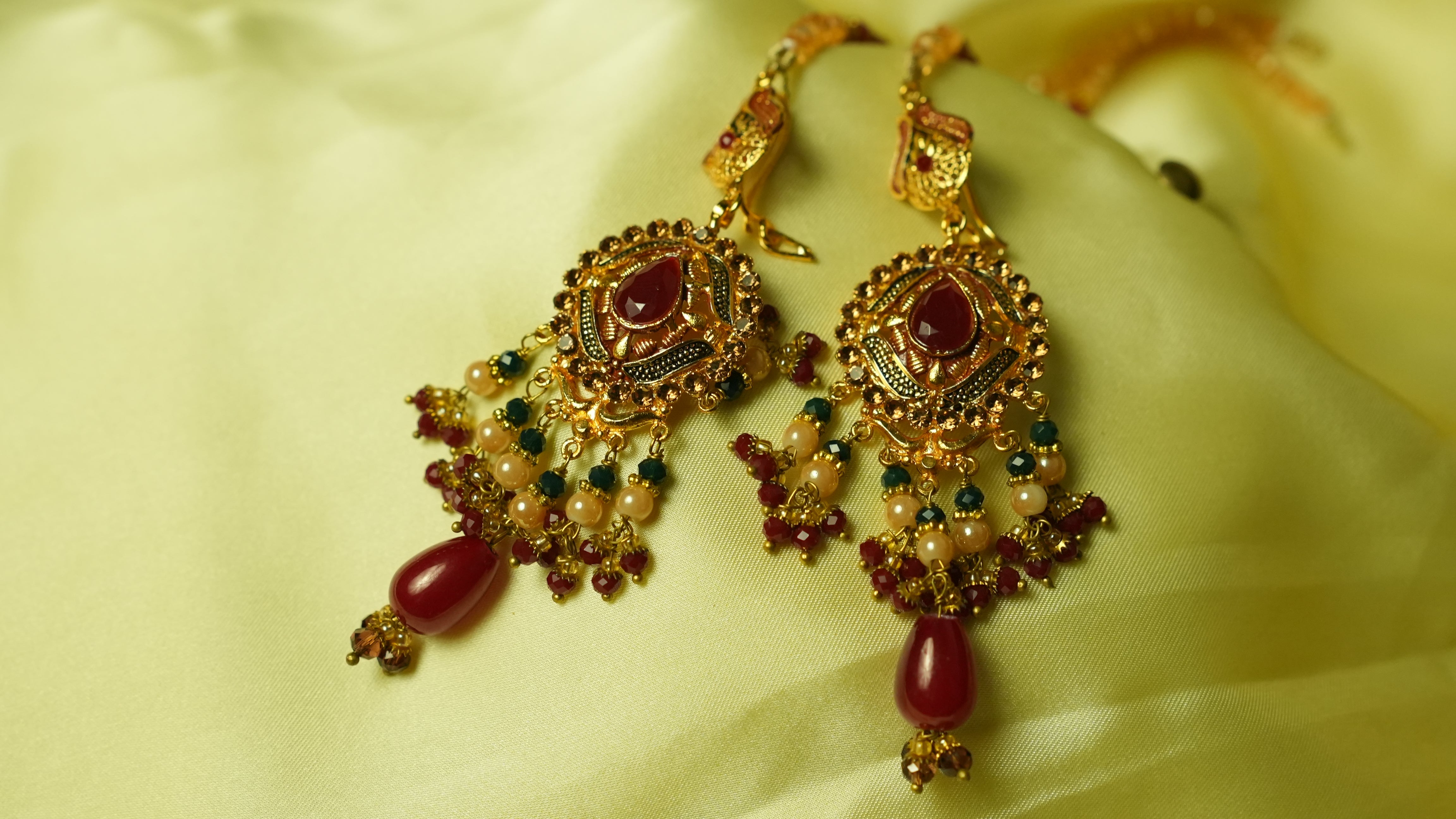 Step into timeless elegance with the Royal Ruby Heritage Set, a masterpiece inspired by traditional royal jewelry. This set features a breathtaking gold-toned necklace adorned with deep ruby red stones, green accents, and intricate filigree detailing. The matching earrings complete the look with regal sophistication, making it perfect for weddings, festive celebrations, and cultural occasions. Each element showcases fine craftsmanship, adding a touch of vintage glamour to your ensemble.